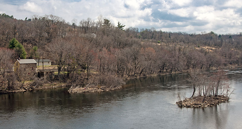 - View from the west of the tollhouse showing the remains of the two chain bridge piers in the Lehigh River; photo credit Richard Musselman (2019)
